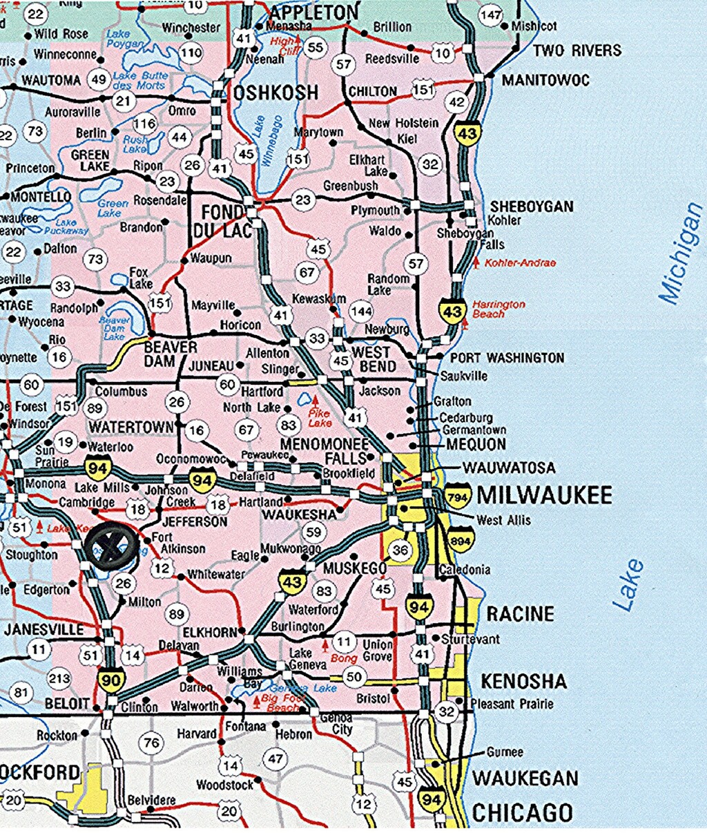 We are located in the small village of Busseyville, WI, which is in between Edgerton, WI, and Fort Atkinson, WI, on State Road 106. See the X on the map above. Always use the blacktop/asphalt driveway that goes to the side and then behind the house toward the gray dairy barn. Please do not park in or use the concrete driveway in the front of the house.